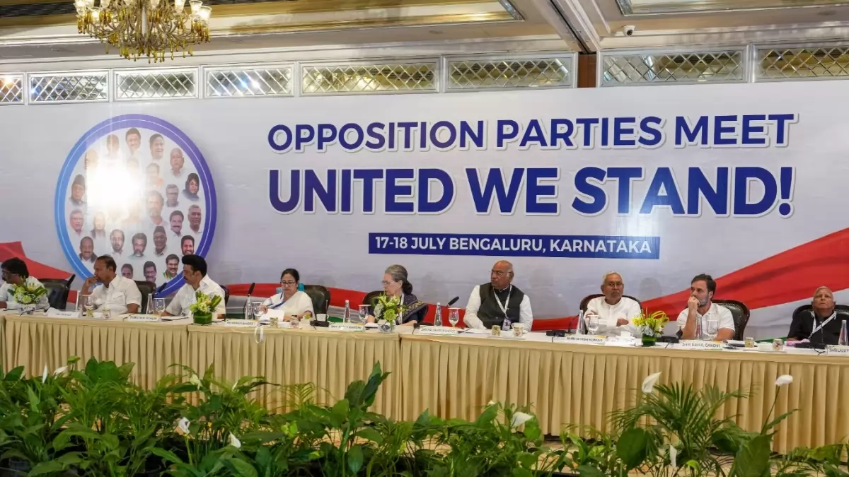 26 opposition groups gathered in Bengaluru, the capital of Karnataka, for a two-day brainstorming session to develop a united platform and agitational agenda to defeat the Bharatiya Janata Party (BJP) in the 2024 Lok Sabha elections, with posters of “United We Stand” all around them.
