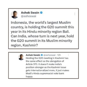Amusingly, Ashok Swain had been urging the Modi administration to hold the G20 summit in Kashmir up till six months ago. Swain lauded Indonesia for hosting the G20 summit in the “Hindu minority” neighbourhood of Bali and advocated for India to exhibit the same level of religious tolerance by hosting the G20 Summit in “India’s Muslim minority, Kashmir” in 2023.