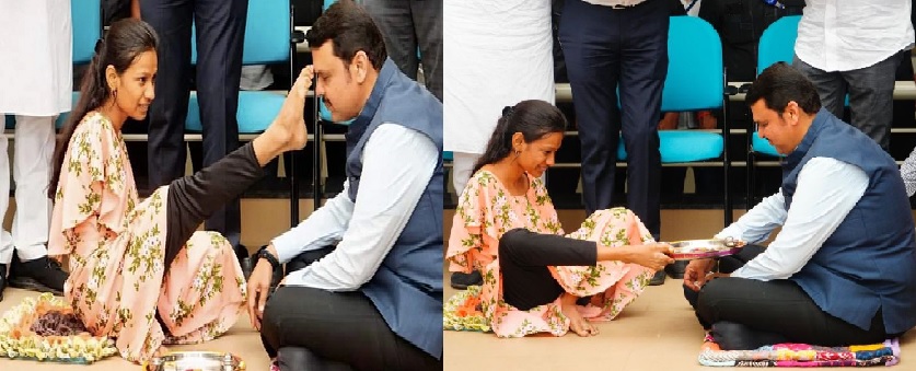 Deputy CM Fadnavis wrote on social media that till date many mothers and sisters performed aarti in the form of blessings and applied Tilak. Even today with the same feeling, a thumb reached to apply Tilak on my forehead… but this time it was not the thumb of the hand but of the foot. Such moments that come in life shake, make the eyes moist, but only for a few moments.
