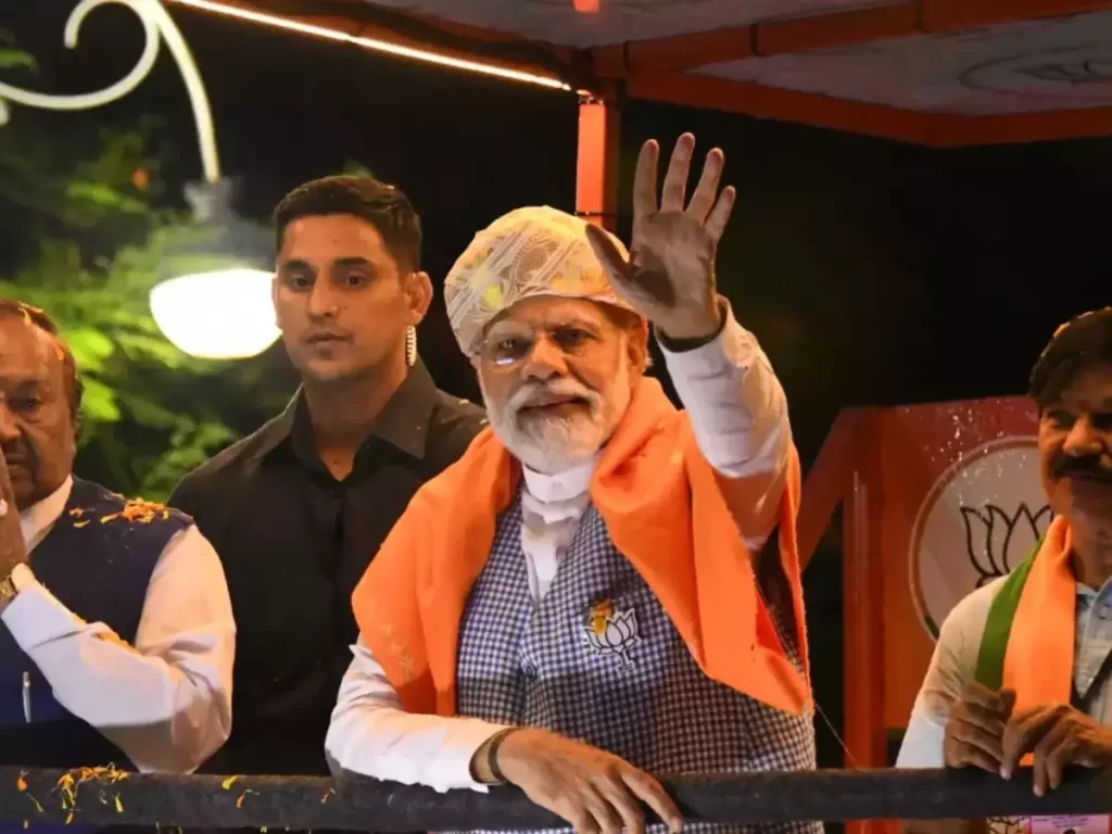 When the incident occurred, Modi was waving to the large crowds of people who had gathered on both sides of the roads, flanked by Mysuru-Kodagu MP Pratap Simha, former ministers K S Eshwarappa, and S A Ramadas.