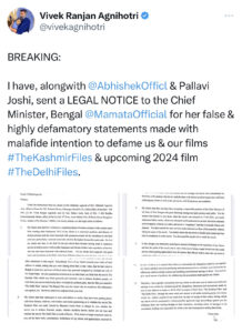 According to Vivek Agnihotri’s legal notice, Mamata Banerjee’s comments seriously damaged the director’s reputation and hurt the movie’s financial performance at the box office. After the announcement of his 2024 film, “The Delhi Files,” Trinamool Congress (TMC) employees began harassing the director and threatening him. It also emphasised the postponement of Vivek Agnihotri’s book signing in Kolkata. Vivek Agnihotri said in his legal notice that Mamata Banerjee had wrongly accused him of defaming Kashmiri people and had made unfounded claims that the BJP had funded his film. It stressed that “all of my client’s hard work, dedication, honesty, and appreciation have been damaged with the stroke of a single statement made by you, bringing a bad name to the movie and my clients and the same is irreparable.” The court notification demanded that Mamata Banerjee either provide authenticated evidence to support her allegations or issue a full apology and retract her false claims. The Kashmir Files and The Kerala Story were described as “distorted movies” by West Bengal’s chief minister on Monday, May 8.